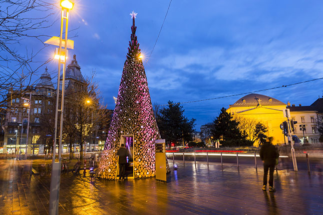 A Hello Wood építész- és dizájnstúdió, a Magyar Ökumenikus Segélyszervezet és a Design Terminál összefogásából kivételes karácsonyfa épült fel Budapesten, az Erzsébet téren. A Hello Wood csapata öt nap alatt épített fel a különleges karácsonyfát, mely ötezer rönkből készült, 11 méter magas és 4 méter széles. A Design Terminállal közösen készített alkotás elemeit januárban rászorulóknak osztják szét tűzifaként a Magyar Ökumenikus Segélyszervezeten keresztül. A vízkeresztig látható egyedülálló karácsonyfára már a nemzetközi sajtó is felfigyelt.